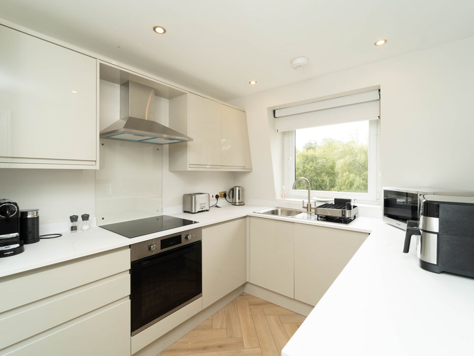 Fully equipped kitchen with integrated oven, hob, fridge-freezer, microwave, toaster, kettle and dishwasher